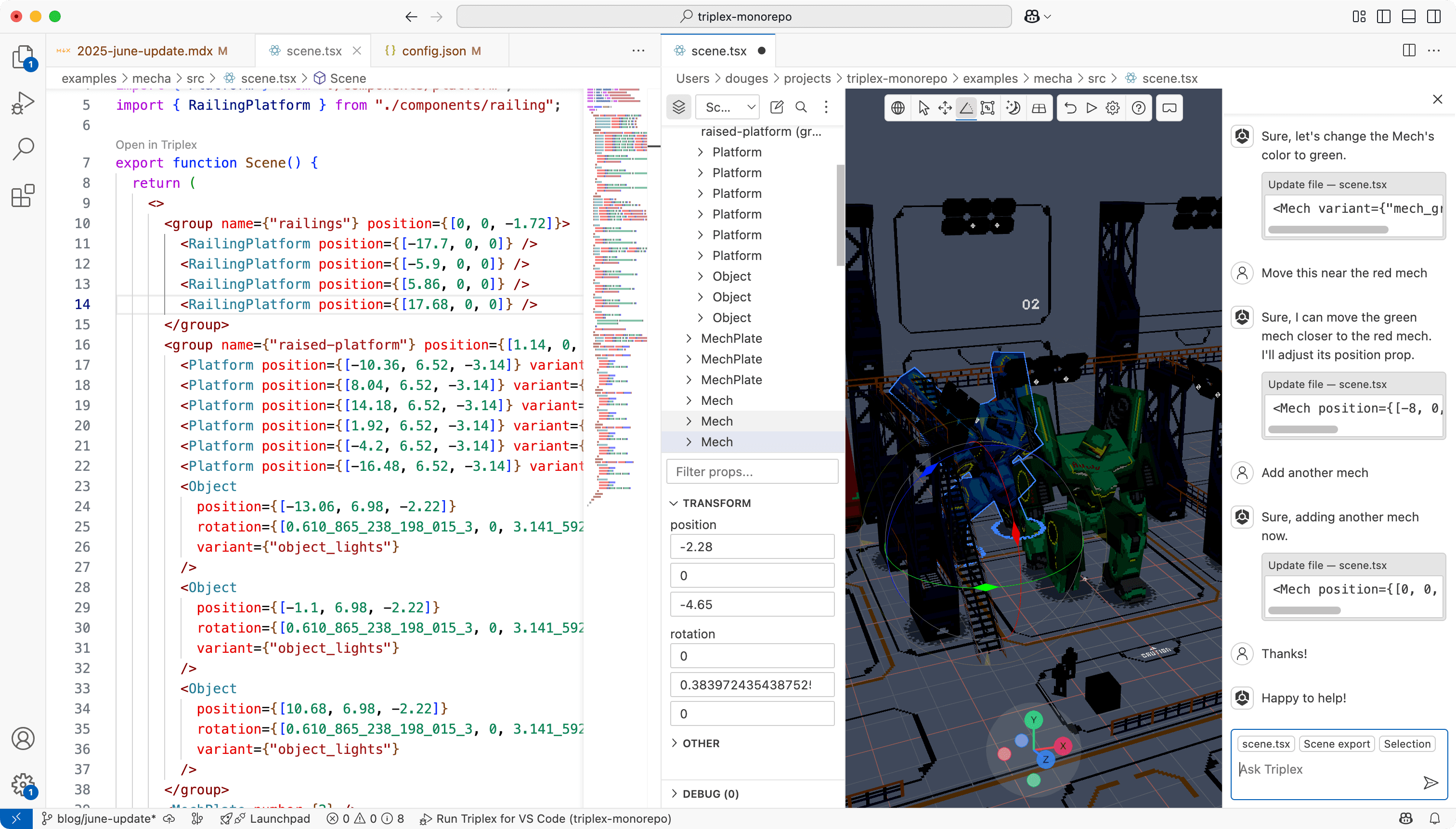AI assisted coding is huge right now, and seeing where it could fit into a Triplex workflow is super compelling. Rather than waiting for the code to be updated through Copilot / Cursor it could be changed directly in the scene by AI, hook into the undo / redo / save workflow you're used to, and enable you to quickly iterate on your components.